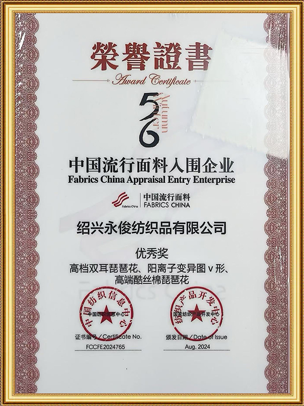 En tant qu'entreprise avec plus de vingt ans d'expérience dans l'industrie de la doublure, Shaoxing Yongjun Textile Co., Ltd. possède des laboratoires de R&D avancés et des processus techniques complets, permettant de répondre rapidement aux demandes du marché et de lancer des produits à haute valeur ajoutée. Dans la recherche et le développement de doublures 100 % viscose, l'entreprise investit massivement dans l'optimisation de la structure des fibres et de la composition chimique tout en répondant aux exigences modernes de conception de vêtements, en produisant des doublures adaptées à la teinture, à l'impression, au marquage à chaud, au gaufrage et au traitement des composites. Grâce à une innovation technologique continue, Yongjun Textile a obtenu plusieurs brevets et certifications techniques, garantissant que les performances des produits atteignent les meilleurs niveaux de l'industrie.